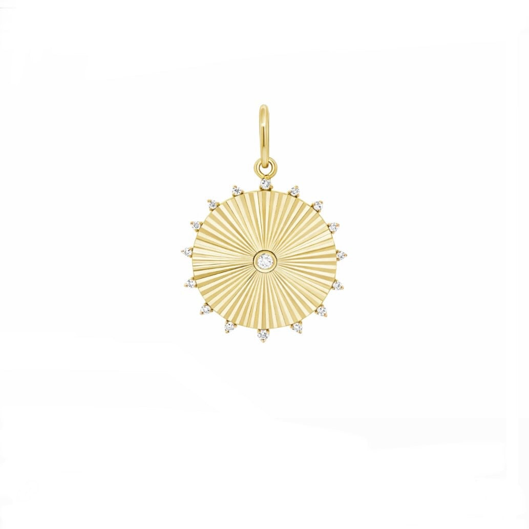 This Fluted Disc Charm features a sophisticated diamond cluster centerpiece. Designed with an enhancer bail, it easily attaches to your favorite chains. Its elegant fluted design complements the diamond cluster, making it a versatile and timeless accessory.